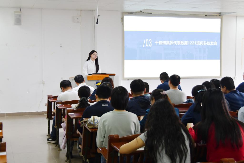 集团“十佳班集体”代表数据1221班何芯仪同学做班级建设经验发言,重点介绍了“三维一体”建设经验:以主题班会强化思想引领,以“学习小组+打卡制度”夯实制度保障,以“竞赛+科研”推动实践创新,班级实现学业竞赛双丰收。