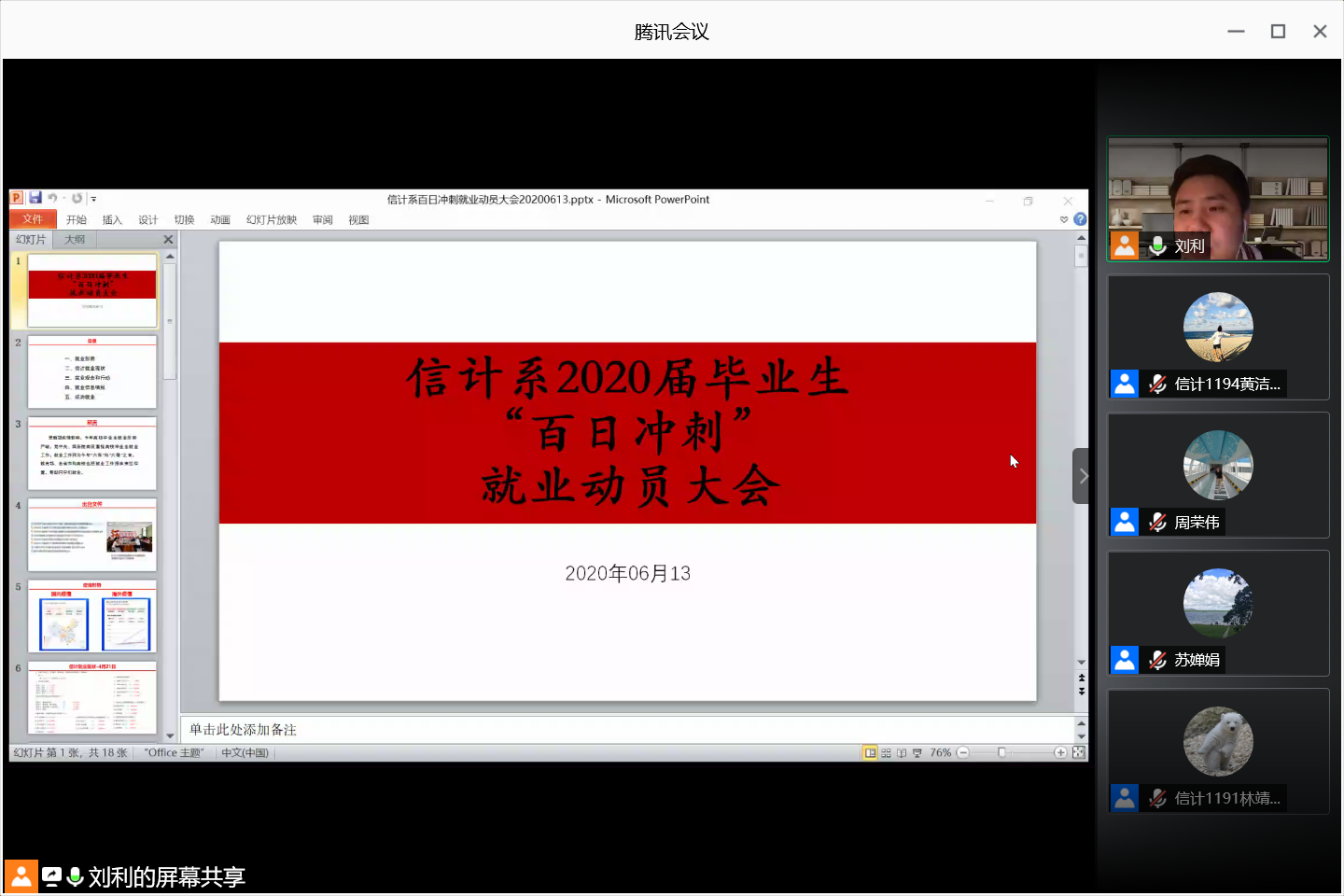紧张的毕业设计和答辩后,信息与计算科学系立即把工作焦点投入到毕业生求职和就业指导上。6月13日晚,信计系在腾讯会议再次召开毕业生“百日冲刺”就业动员大会,公司党委副书记周荣伟、副经理陈入云、系正副主任邝雪松、王红青、韩筠、政治辅导员、毕业班班主任和信计系2020届全体毕业生参会。会议由辅导员刘利老师主持。