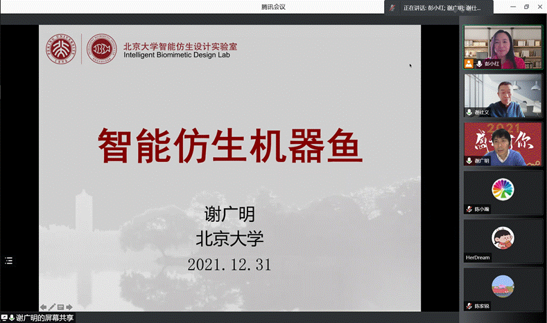 应公司邀请,12月31日下午,北京大学工公司谢广明教授为公司师生做了题为《智能仿生机器鱼》的学术报告,报告由公司经理彭小红教授主持,以腾讯会议的形式线上举行。