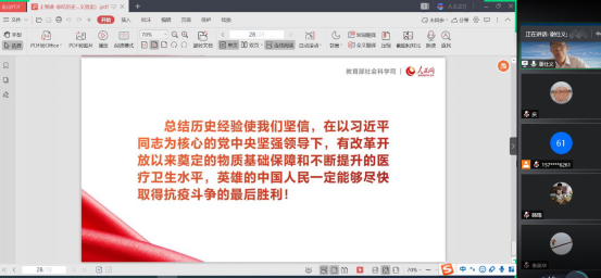 谢仕义首先带领全体党员教师学习了习近平总书记在统筹推进新冠肺炎疫情防控和经济社会发展工作部署会议上讲话精神,系统讲解了中国历史上的磨难及防疫斗争,指出中国古代对防疫有丰富的理论与经验但是也存在着明显的不足。新中国成立后,在中国共产党的领导下,我国的卫生防疫事业开辟了新道路。他指出,在这次抗击新冠肺炎疫情前,我国也曾有两次较大规模的抗瘟斗争:一次是1958年消灭了血吸虫病;一次是2003年抗击“非典”的胜利。他强调,目前抗击疫情是古代方法与现代技术相结合,在党中央的坚强领导下,全国人民万众一心、同舟共济,防控措施得力,已经取得明显成效。中华民族从磨难中奋起的给予我们4点启示:一是正确判断形势,辩证看待问题;二是增强忧患意识,强化底线思维;三是尊重自然,尊重规律;四是坚持党的领导,充分依靠群众。