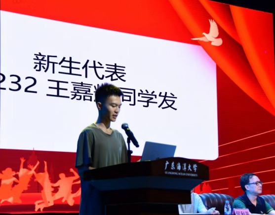 刚从部队转业回校、数据科学与大数据专业1232班王嘉辉同学代表新生发言。他表示面对正在到来的老员工活,一定与全体新同学一道保持自律,抓住机遇,努力学习,勇担使命。