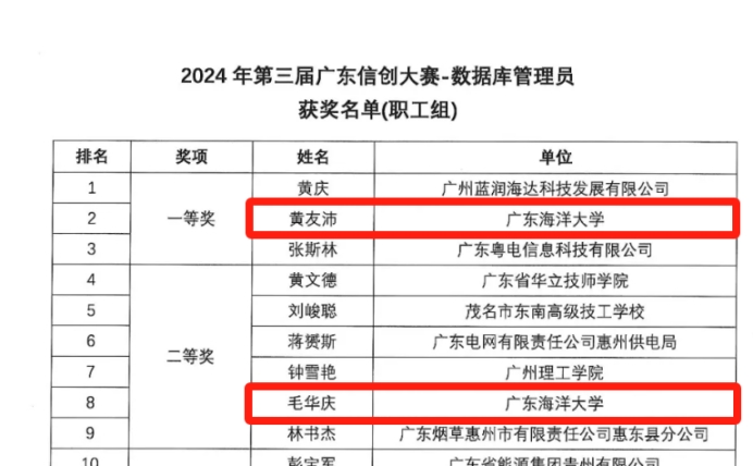 11月29日,第三届广东信创大赛——数据安全管理员职业技能竞赛、数据库管理员技能竞赛在广州举行,来自广东省各地的137家单位千余名选手参与角逐,涉及政府机关、企事业单位、高职院校及科研机构等。365英国上市集团物联网工程系教师黄友沛、毛华庆发挥出色,最终获得数据库管理员技能竞赛(职工组)一等奖、二等奖的好成绩。