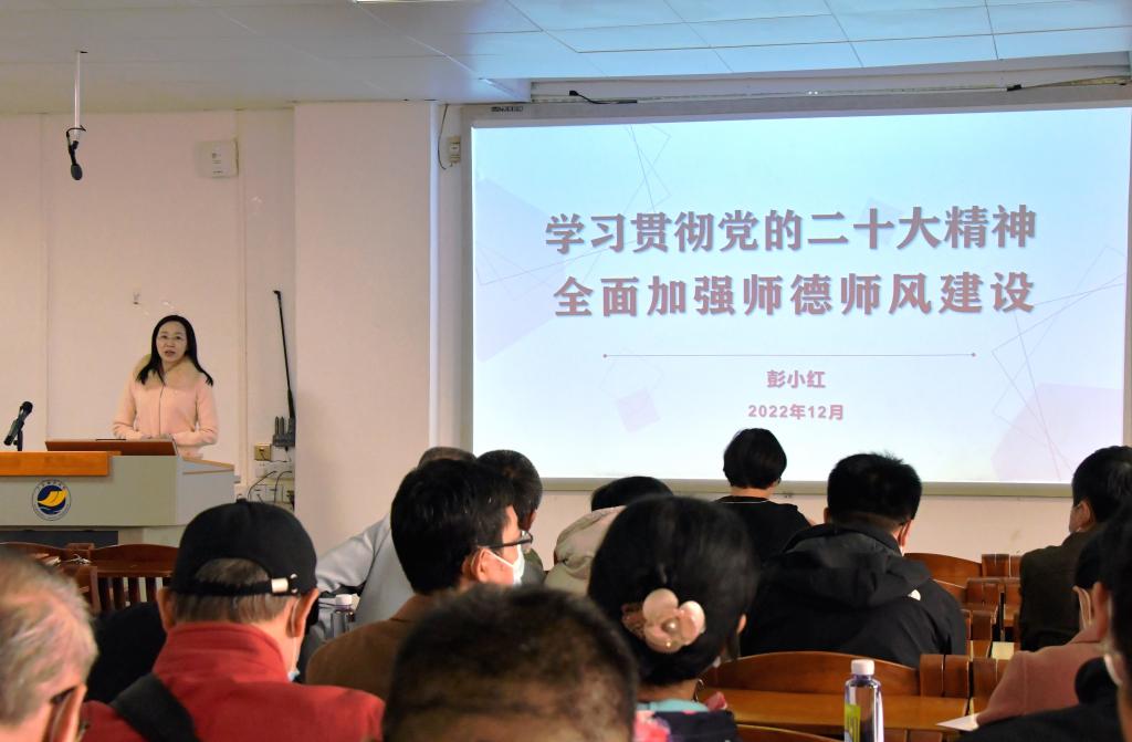 彭小红以《学习贯彻党的二十大精神全面加强师德师风建设》为题,通过介绍党的二十大报告中关于教育的关键词,讲解了党在新时代的教育方略;通过诠释师德师风的内涵、领学习近平总书记关于师德师风建设的重要论述及新时代师德师风规范,展示了师德师风在教育中的重要作用;通过鲜活的案例分析了当前高校师德师风建设现状,她号召全体教师更加自觉地担负起为党育人、为国育才的光荣使命,要坚定理想信念,坚持师德为“本”;要强化责任担当,坚持能力为“上”;要心怀“国之大者”,坚持创新为“要”,争做师德高尚、业务精湛的好教师。