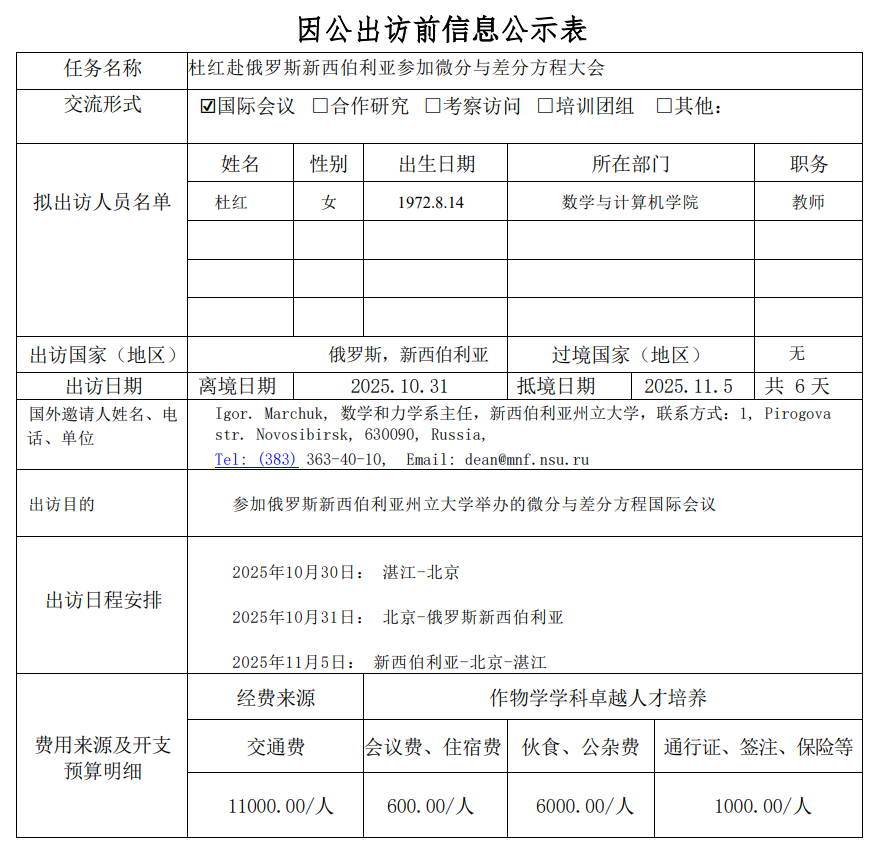 根据《关于进一步规范省部级以下国家工作人员因公临时出国的意见》的要求,现将杜红同志因公出访前信息予以公示(详见附表),公示时间为2025年9月22日至2025年9月26日。如有意见,请于公示期间向公司反映。