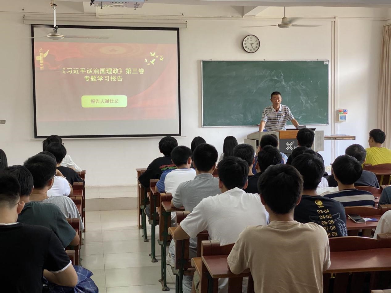 党委书记谢仕义教授从《习近平谈治国理政》第三卷出版的重大意义、主要内容和如何学习贯彻落实书中习近平新时代中国特色社会主义思想等三方面,为员工讲授了一堂生动的思政课。他号召全体员工大力弘扬理论联系实际的优良学风,学深悟透《习近平谈治国理政》第三卷,呼吁员工务必了解历史,不要崇洋媚外,坚持道路、文化、理论、制度自信,一切从实际出发,不忘初心、牢记使命。同时对员工提出三个要求:一要真情实感读原著;二要真心实意学原文;三要真下功夫悟原理。告诉员工应反复阅读这部重要著作,要做到“知其然更知其所以然”。